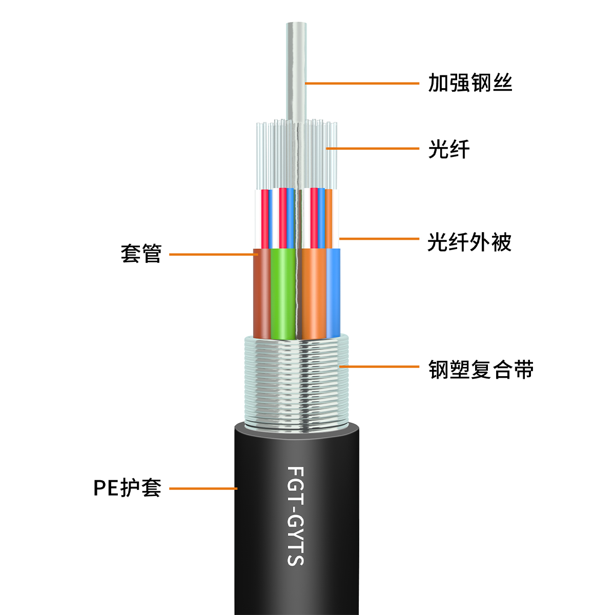 FGT 層絞式系列光纜,也稱GYTS/GYTA光纜,執行標準:IEC 60793、YD/T 901ISO/IEC 11801、ANSI/TIA-568.3-D,產品達到國內先進水平